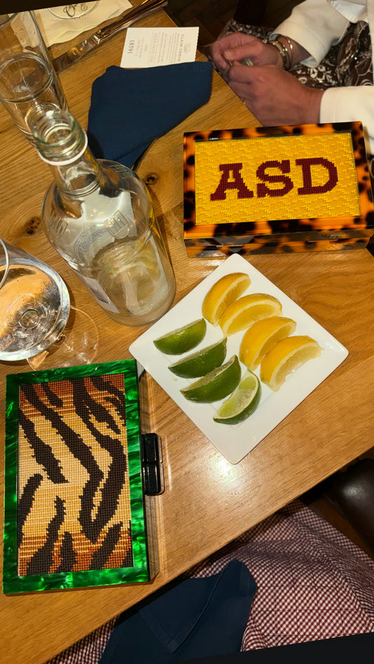 A collection of needlepoint accessories that are as luxe as your artwork. Project bags, stash trays and sturdy totes will keep your precious projects inspired and secure! Each is an exclusive Tigre de Tartán design, featuring various illustrations and trompe l'oeil prints by independent female artists and hand made in London, England.