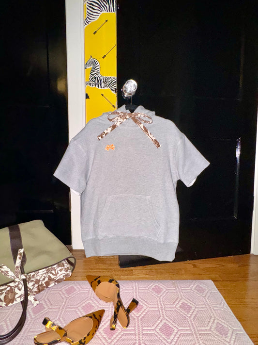 Cutoff Sleeve Hoodie with Wide Patterned Drawstring