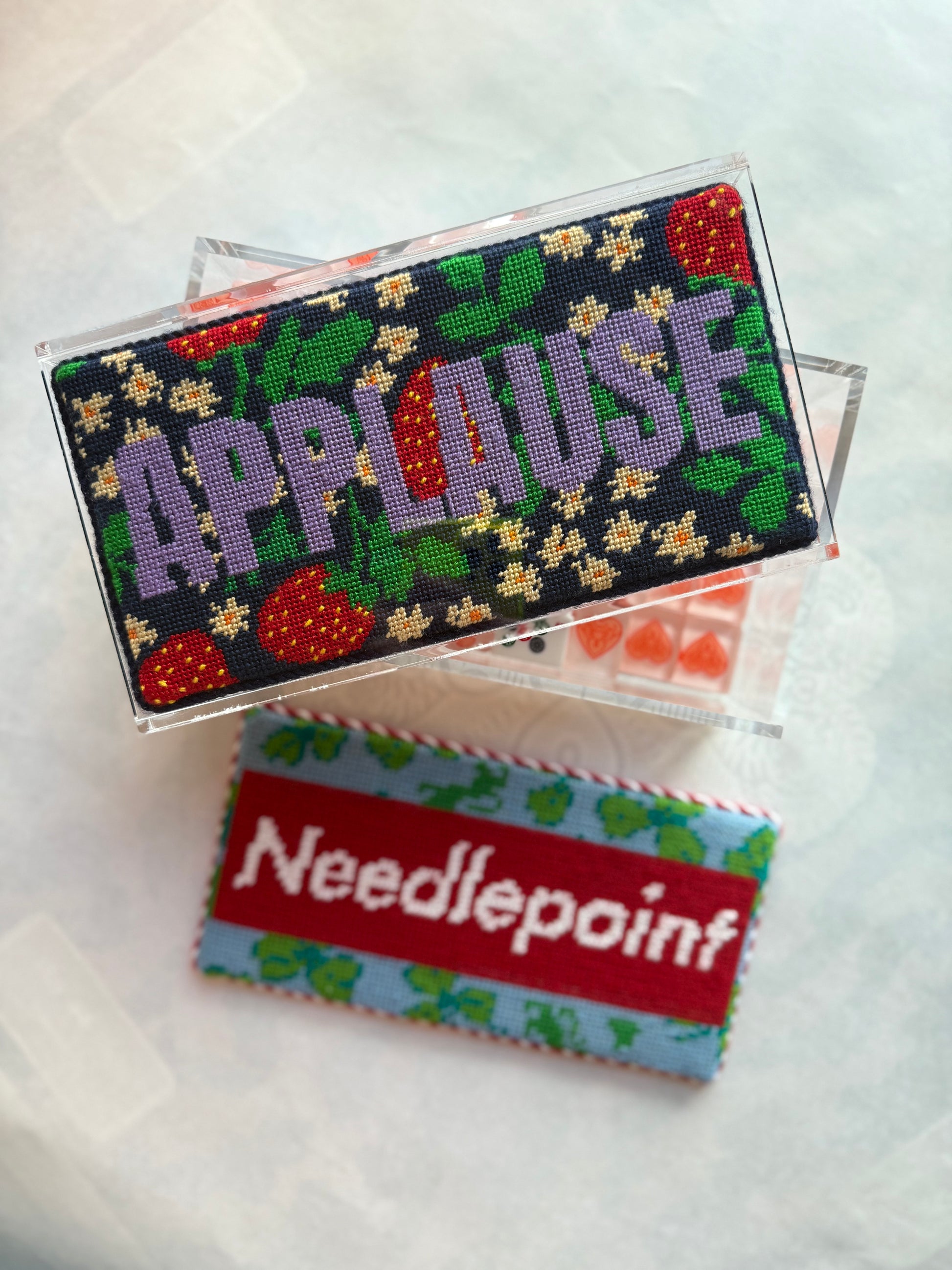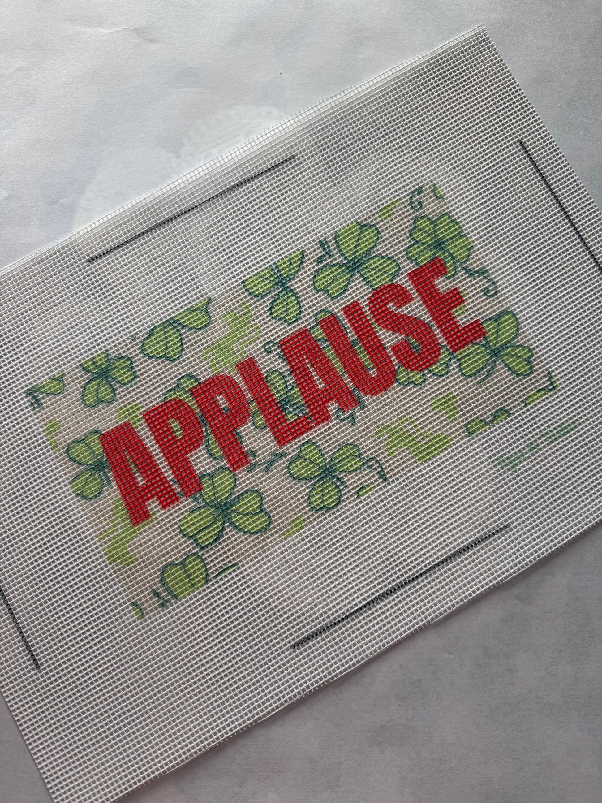 Our APPLAUSE needlepoint canvas takes its cue from a vintage applause sign and pairs it with Tigre de Tartán’s house print of clovers for a wink of fun and irony. It’s bold, cheeky, and meant to be stitched with joy, not worry.