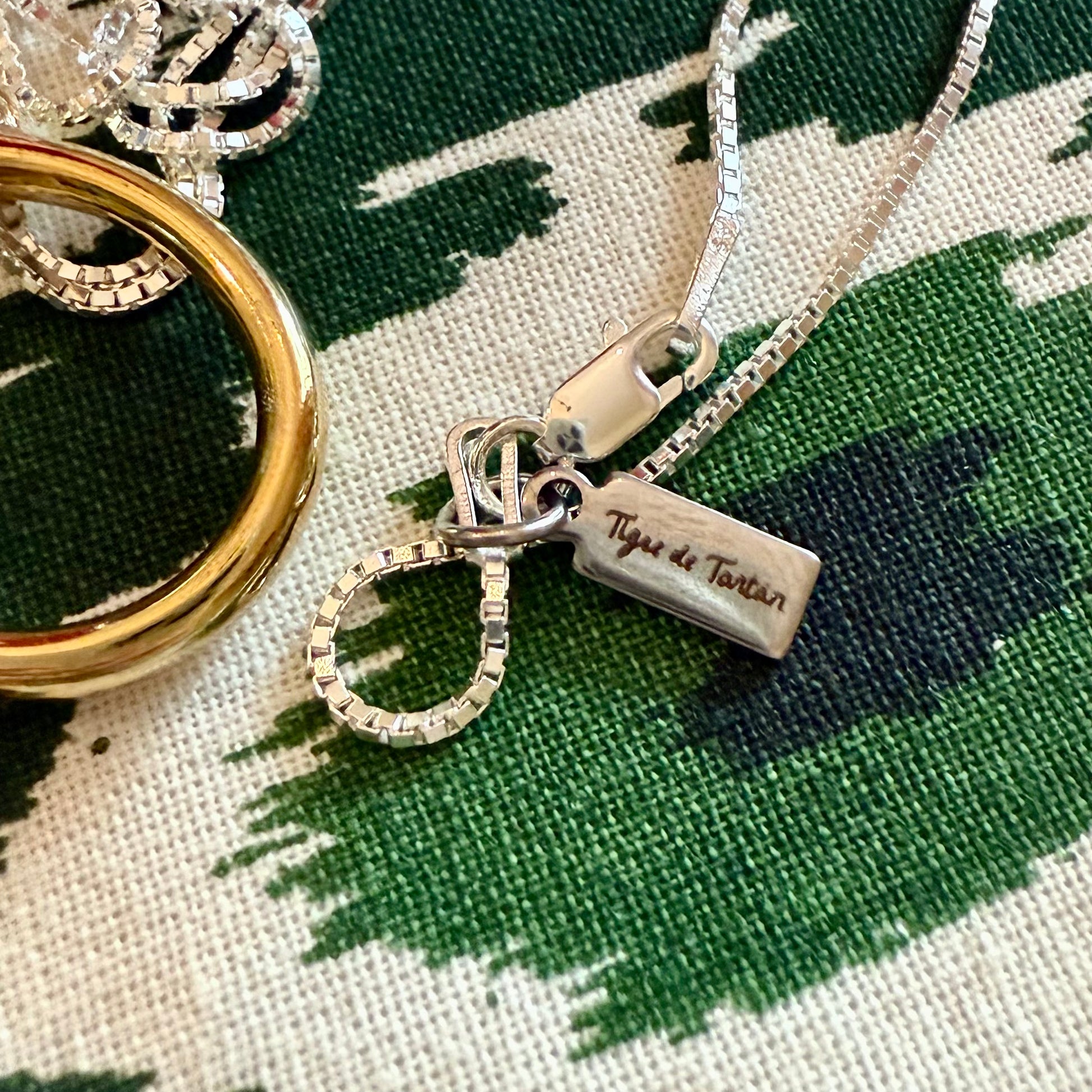 Behold the epitome of portable elegance: a pair of gold plated scissors attached to a lustrous Italian sterling silver box chain. Whether you're snipping a stray thread from a needlepoint project canvas, or delicately trimming the ribbon on a champagne bottle, these scissors will be your trusty, fashionable sidekick. Hangs long enough to pull on and off the neck without unfastening the clasp.