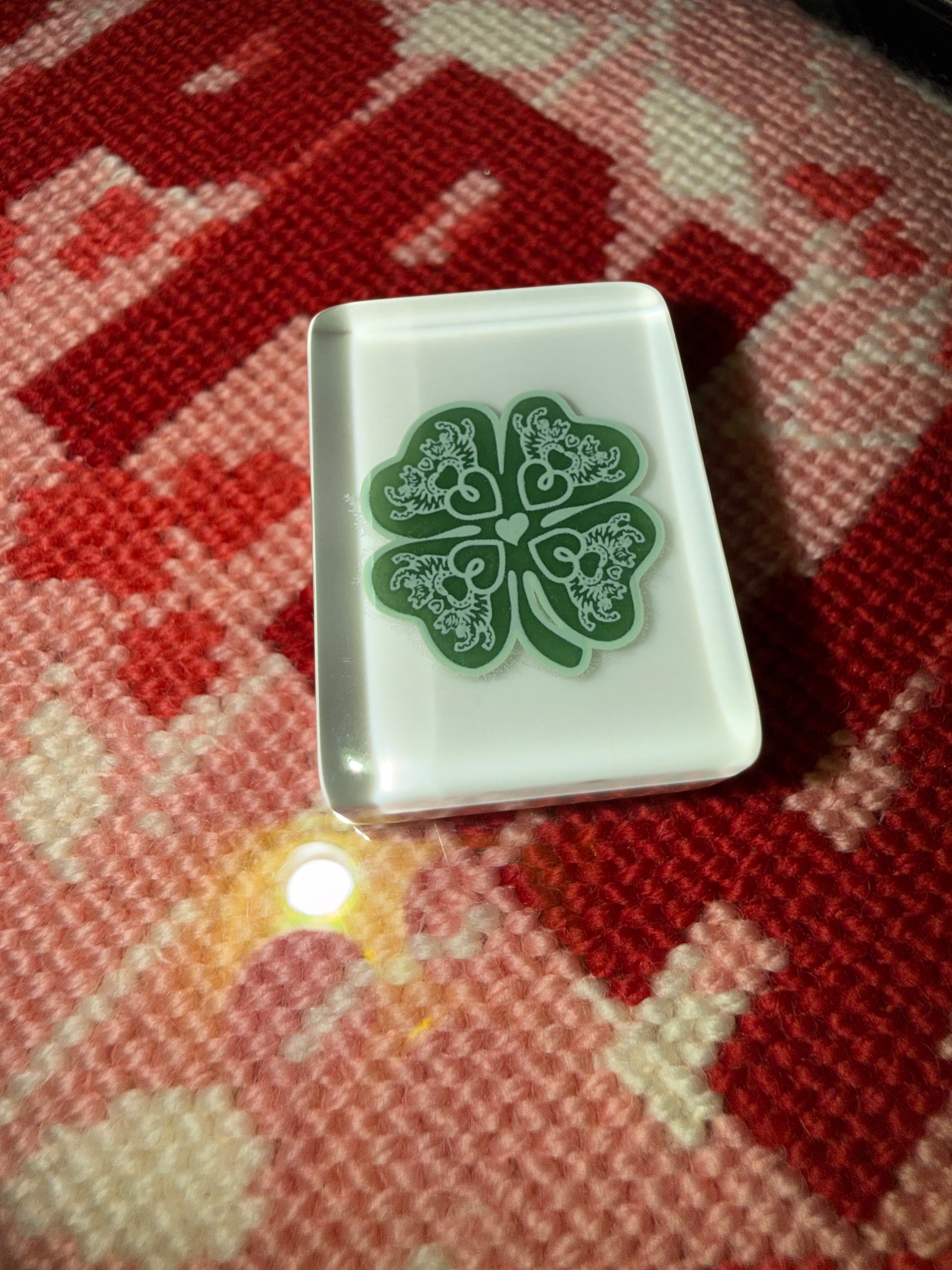 On the back? Our bold clover logo- suspended between two clear layers for a smooth, glassy finish that feels as good as it looks. A symbol of luck, play, and the art-driven spirit behind everything we make.