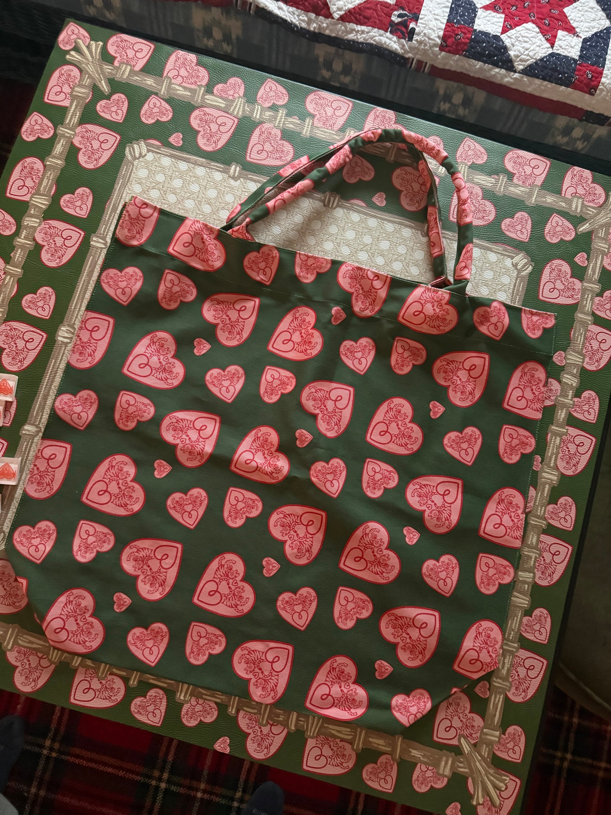 This playful tote pairs our signature logo- rendered in Valentine-inspired glory- against a rich olive green backdrop for undeniable visual punch. Crafted from premium organic denim with a beautifully executed print, this slouchy silhouette brings personality to everyday moments. Whether you're running errands or making a statement, this bag delivers both substance and sass. It's the kind of tote that feels as good as it looks.