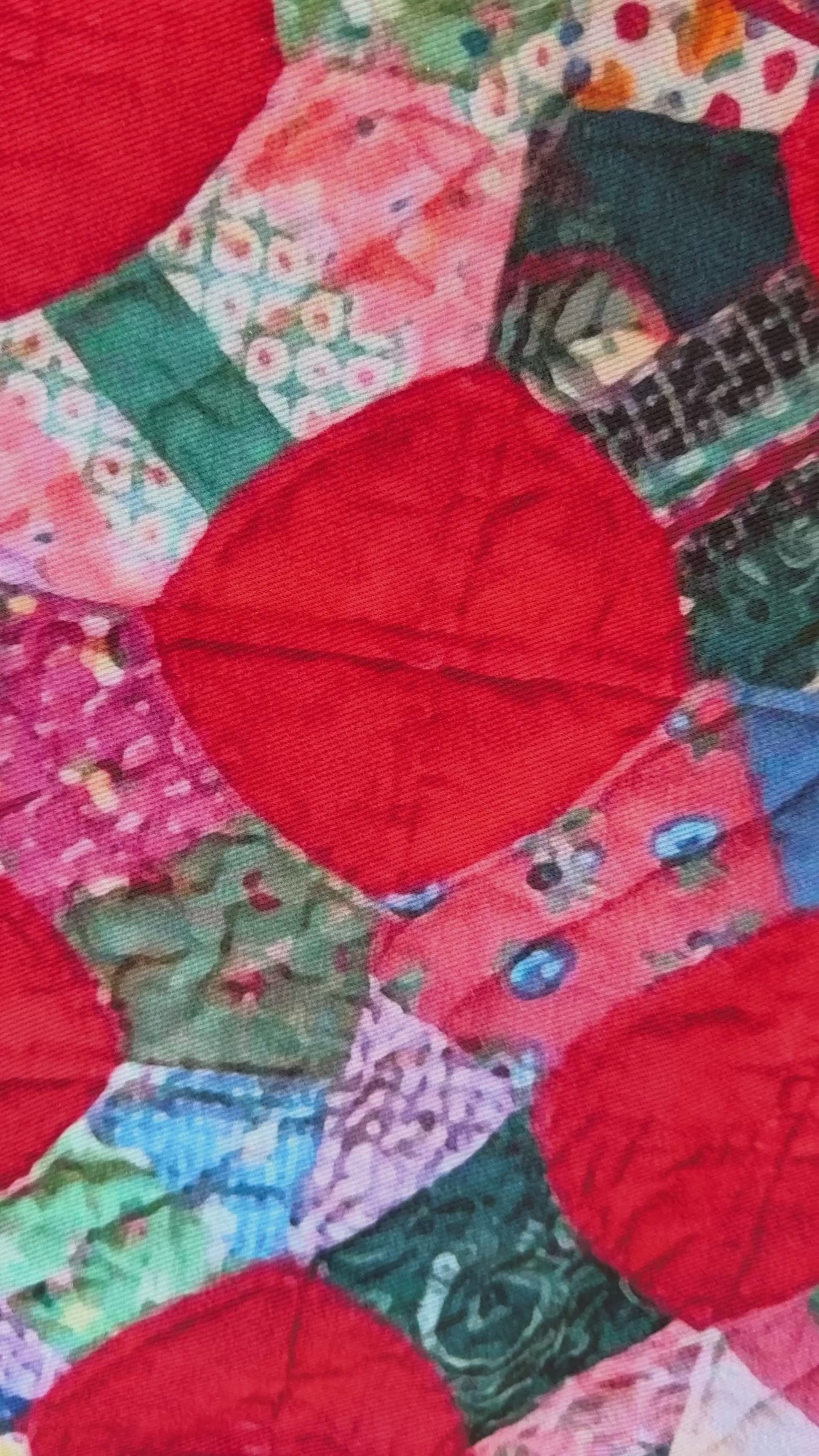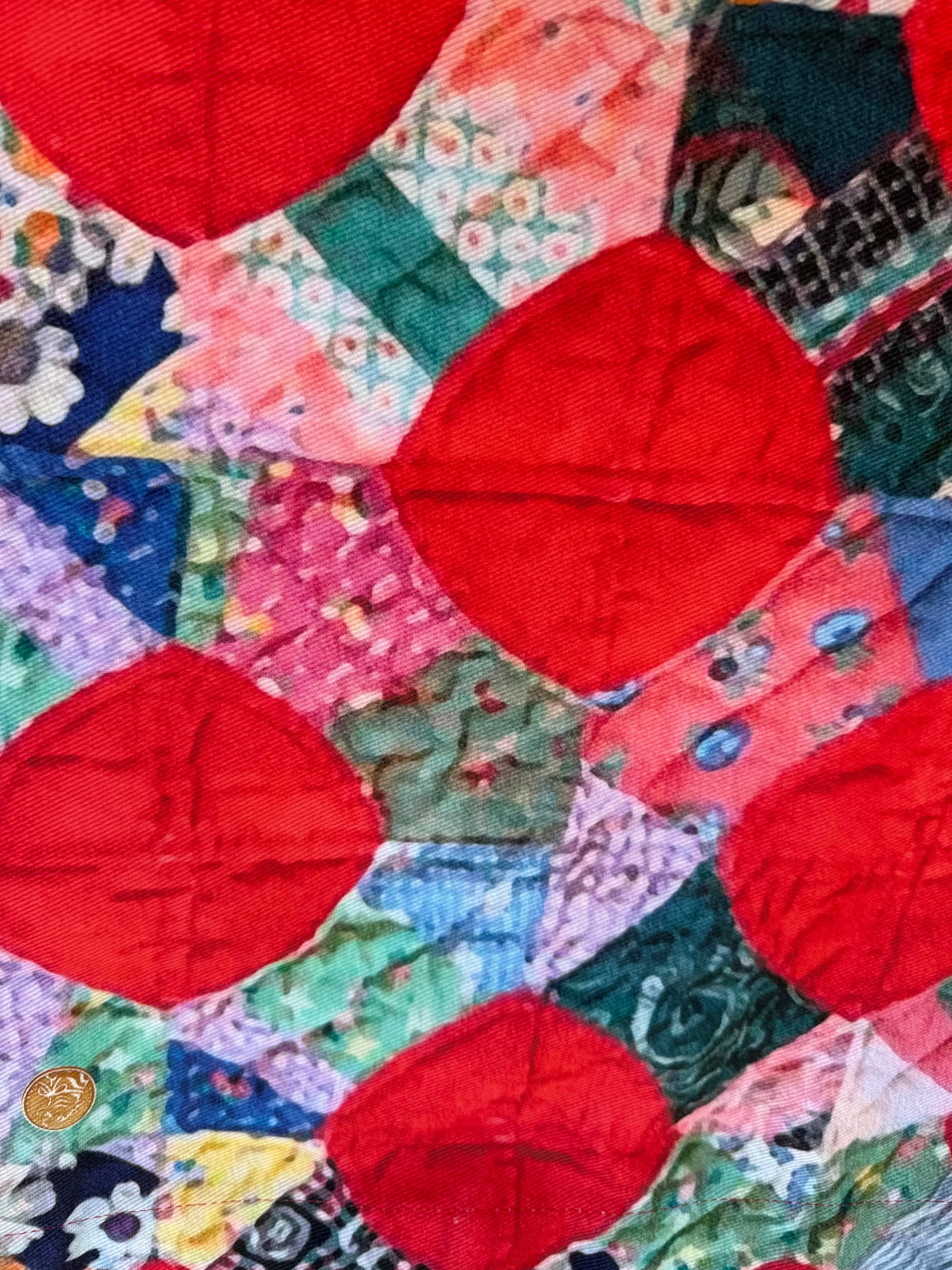 The Macintosh design begins with a vintage Snowball Quilt from Jess’s collection. Tigre de Tartán transformed the bold appliquéd red circles into an original print, creating a tote that’s both striking and heritage-rich. Up close, the painterly texture feels abstract; from afar, the red-on-patchwork effect recalls fall orchards and timeless quilt tradition.