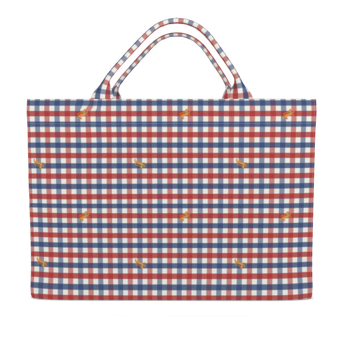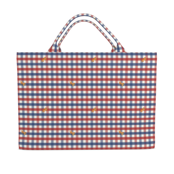 Our twist on classic critter pants: a crisp white gingham base with red and blue checks and a scatter of cheeky little tigers that look embroidered (spoiler—they’re not). This tote does it all, from carrying your needlepoint to crashing a picnic in head-to-toe prep.