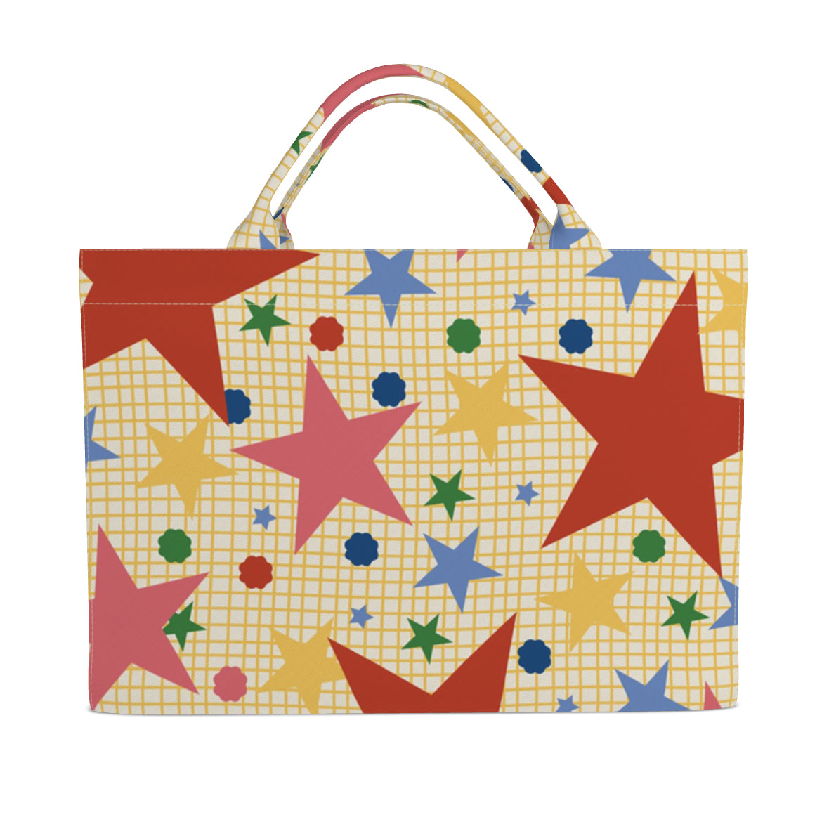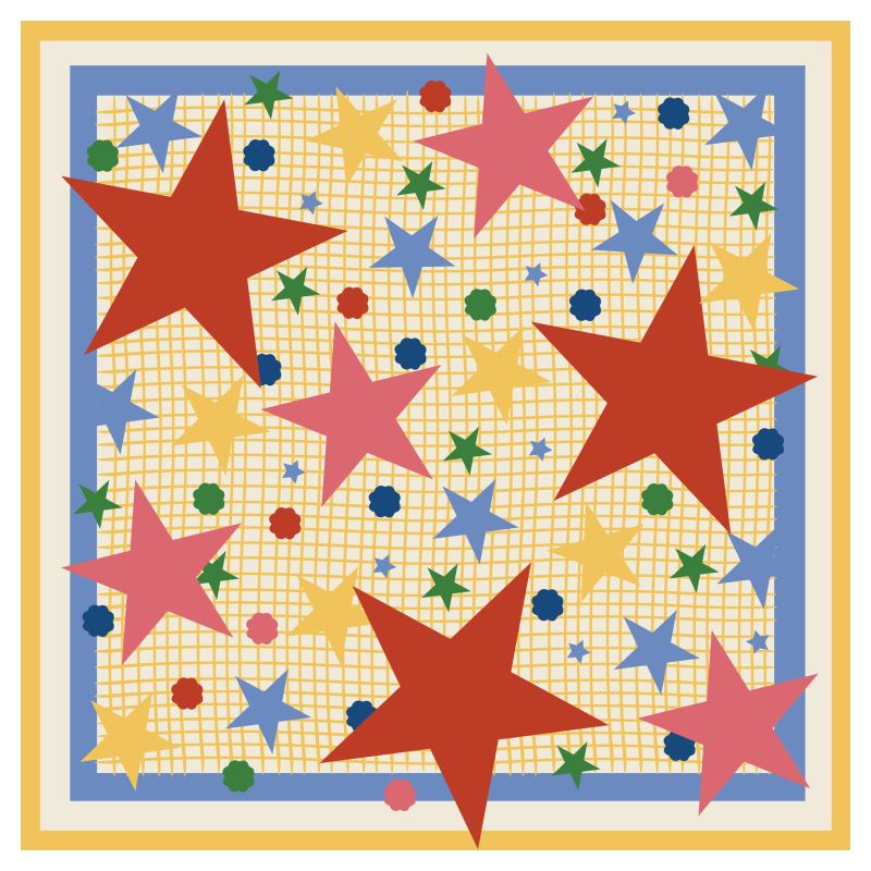 The Star Scatter print pulls from vintage motifs- grids, confetti, bold stars- but reworks them with a painterly edge and just enough bratty joy. Its roller-rink meets editorial layout, and it's designed to spark conversation!