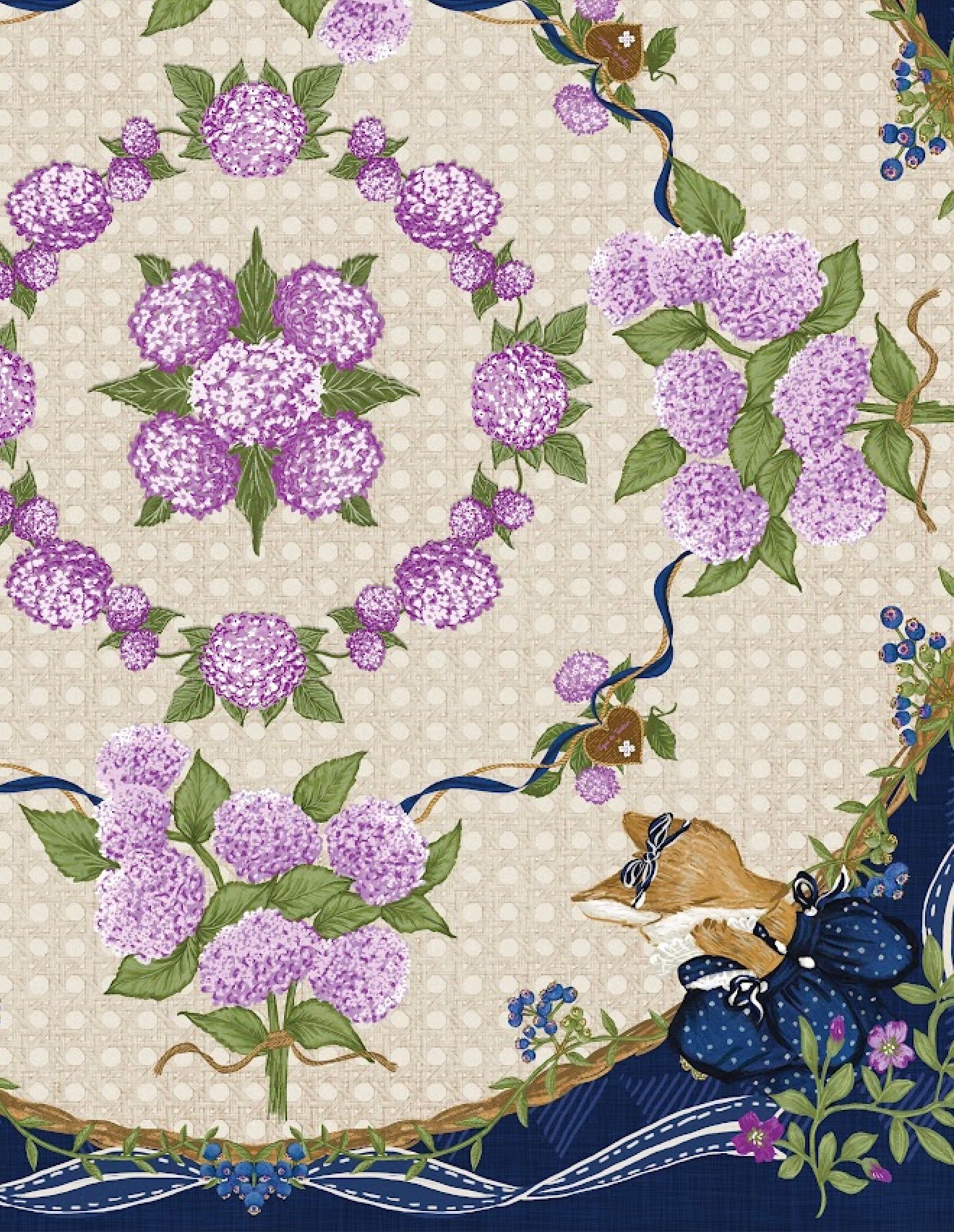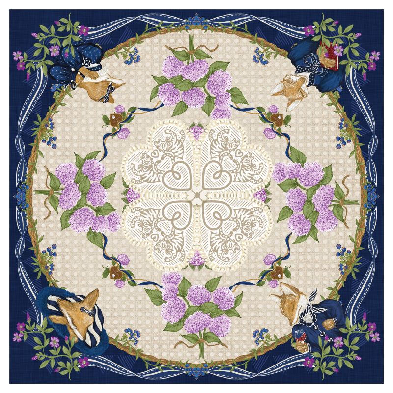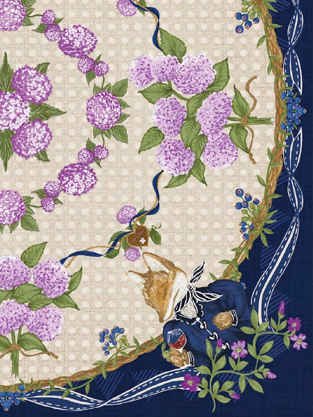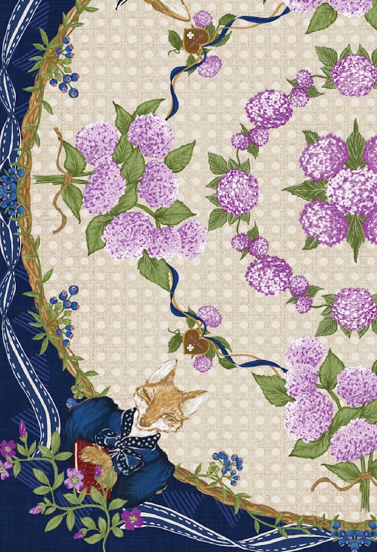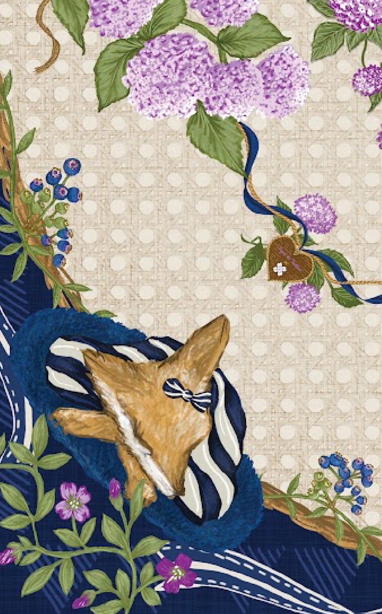 Sloane Story is a whimsical mat inspired by vintage silk scarves, lacquered cane furniture, and the kind of cocktail party where the foxes wear velvet.