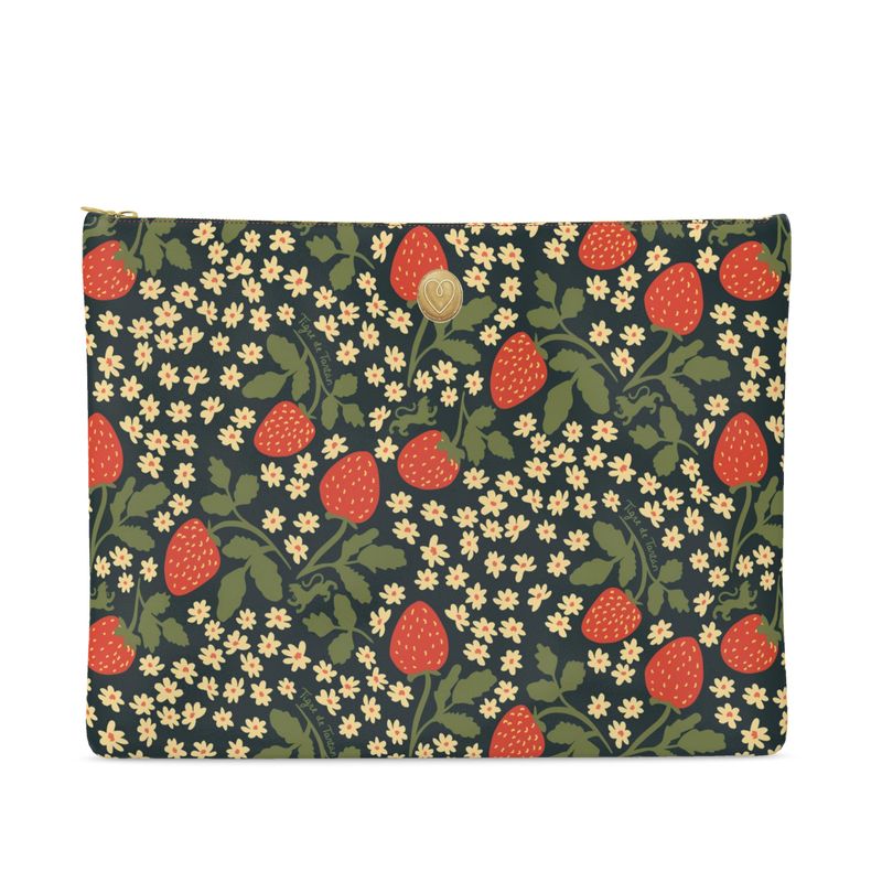 Put a cheeky spin on your look with our fresh strawberry design! This petite yet roomy pouch is brought to life by an independent female artist. Each of the elements, including our signature trompe l'oeil gold buttons, are carefully drawn and custom printed on textured Nappa leather. Hand made to order in London, England.