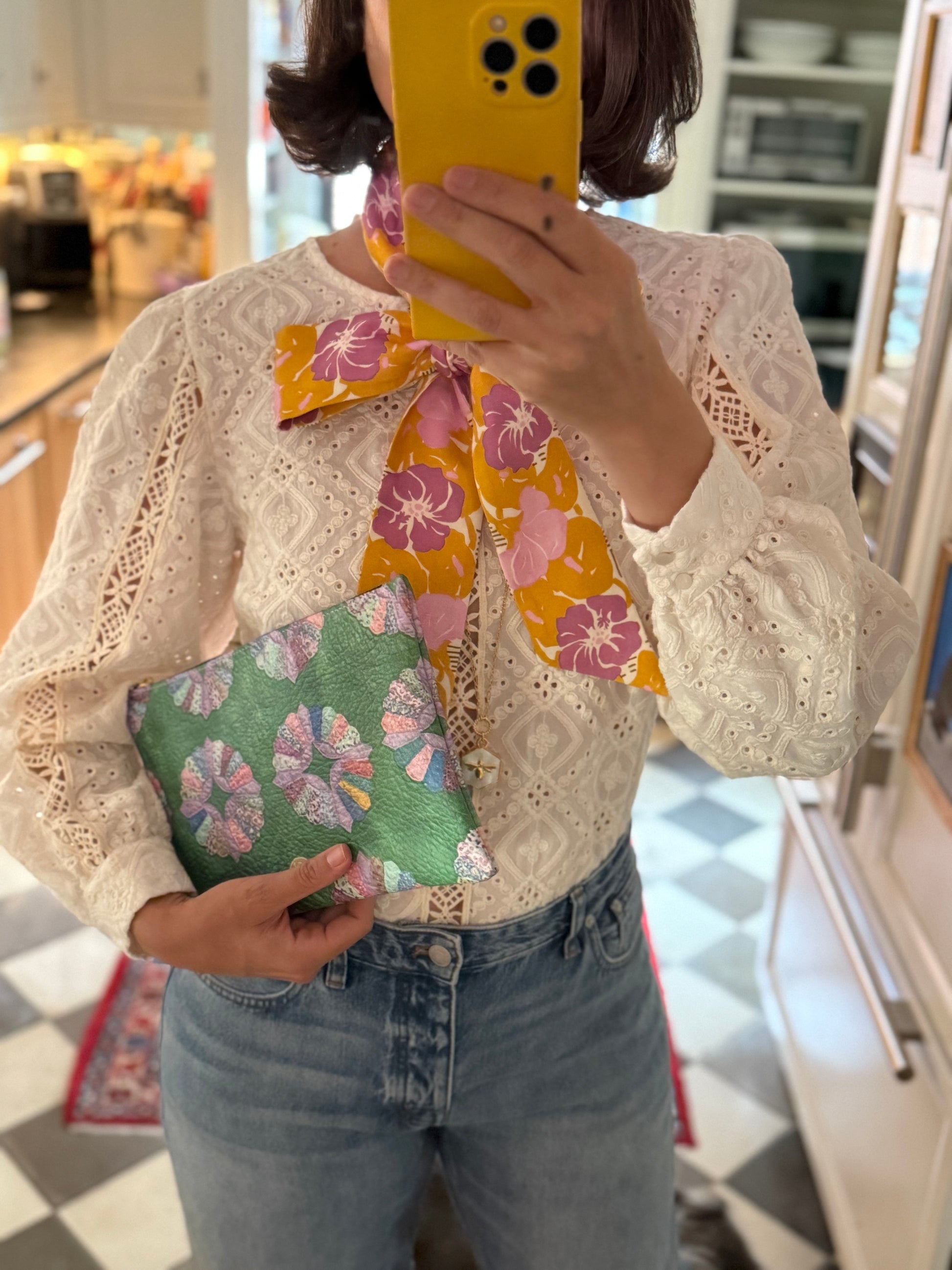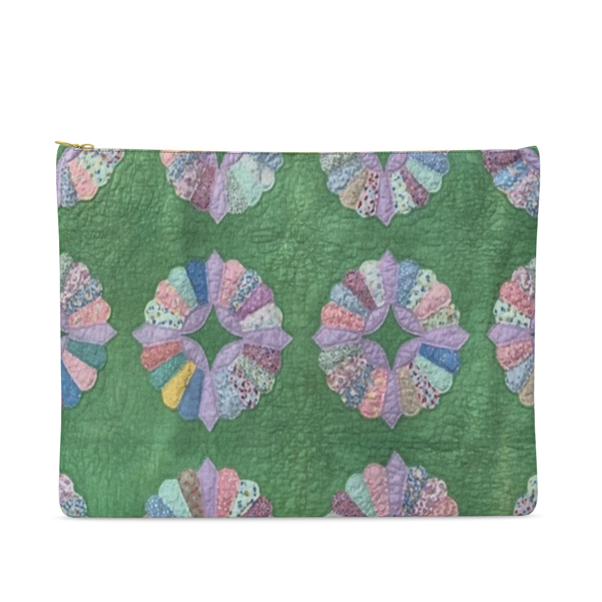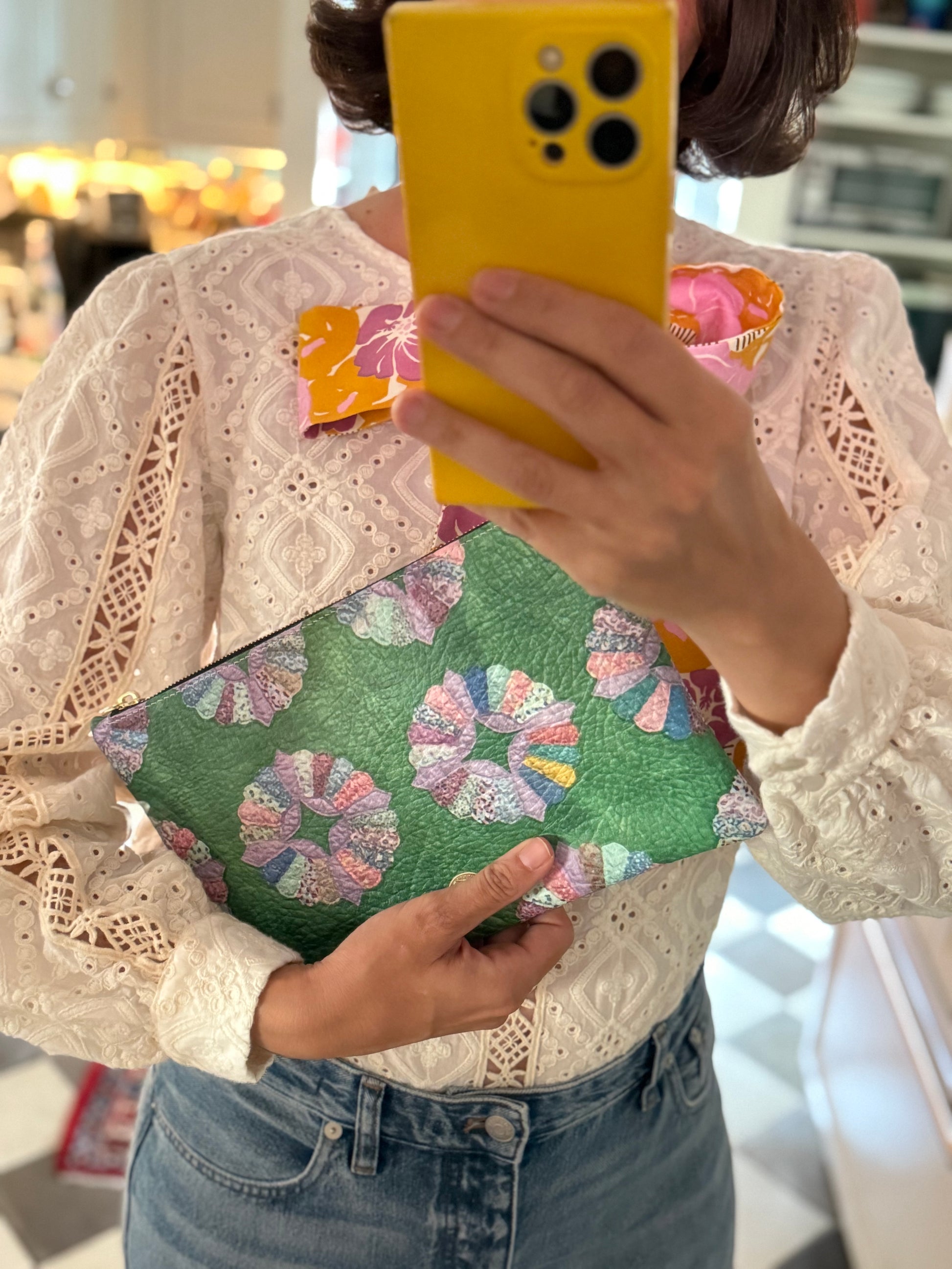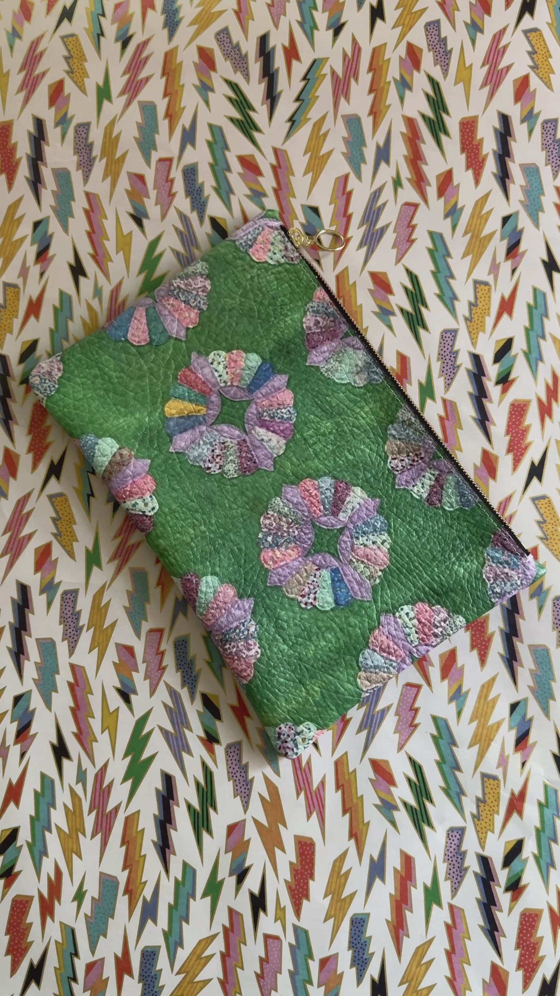 The Verdant Fan design began with a Grandmother’s Fan quilt from Jess’s collection, reinterpreted by Tigre de Tartán into an exclusive custom illustration. Rendered in watercolor and printed on textured Nappa leather, the pattern feels abstract up close but reveals its quilt heritage from afar.
