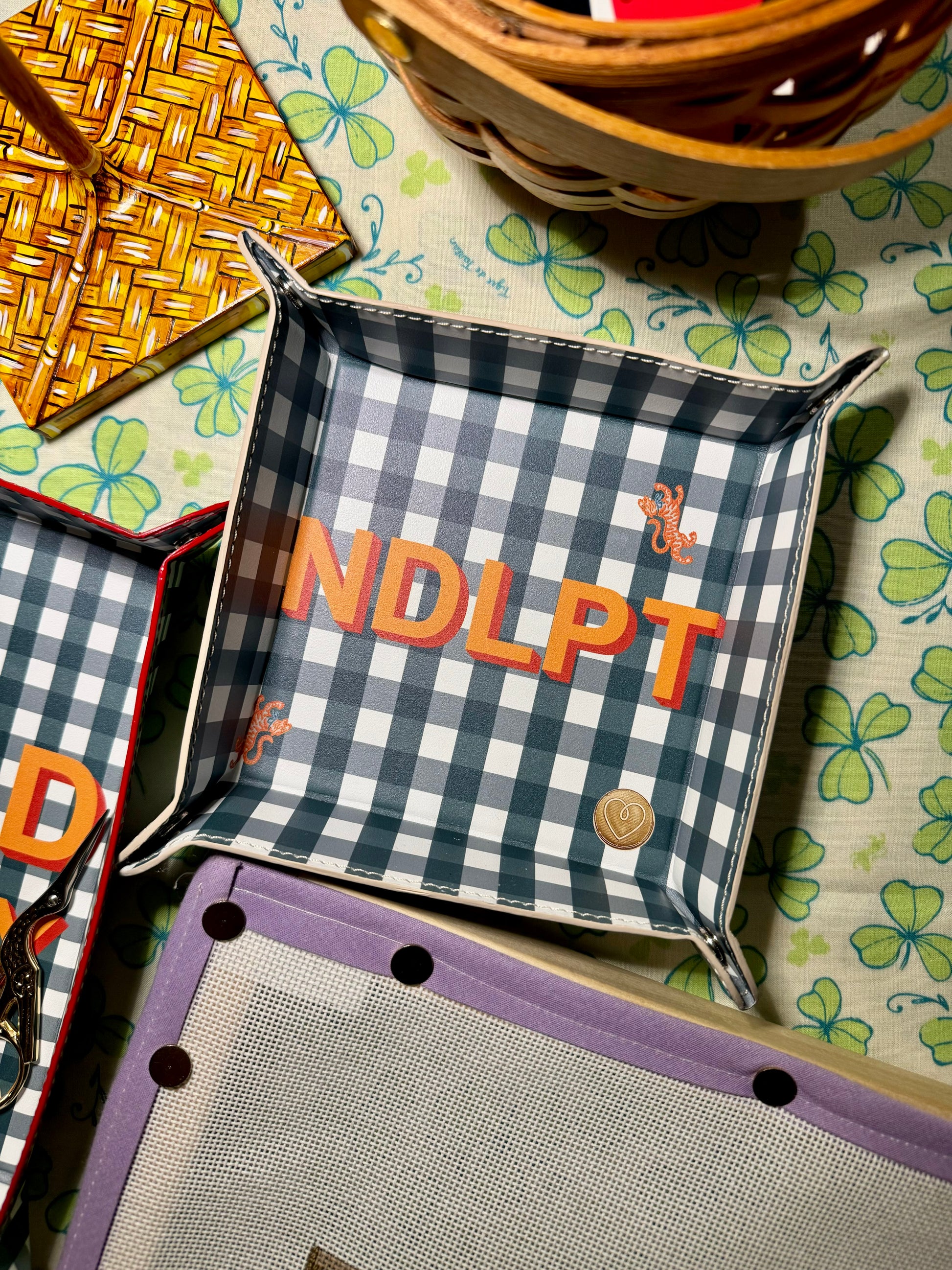 Keep track of all of the little things with this travel friendly genuine leather tray. Snaps to attention for home, unsnaps flat for needlepoint on-the-go! This petite catchall is brought to life by an independent female artist. Each of the elements, including our signature trompe l'oeil gold buttons, are carefully drawn and custom printed on full grain textured Nappa leather. Hand made to order in London, England.