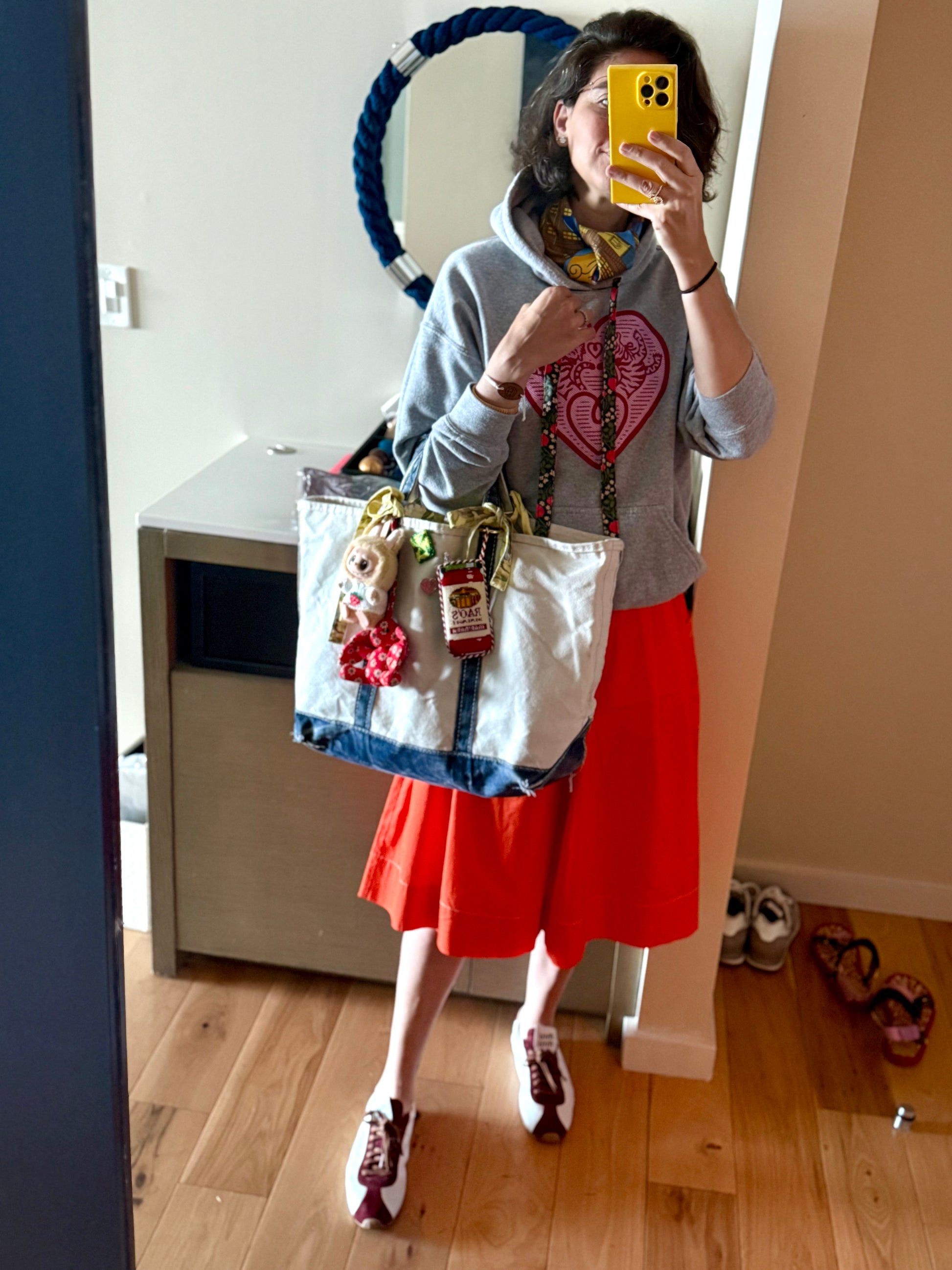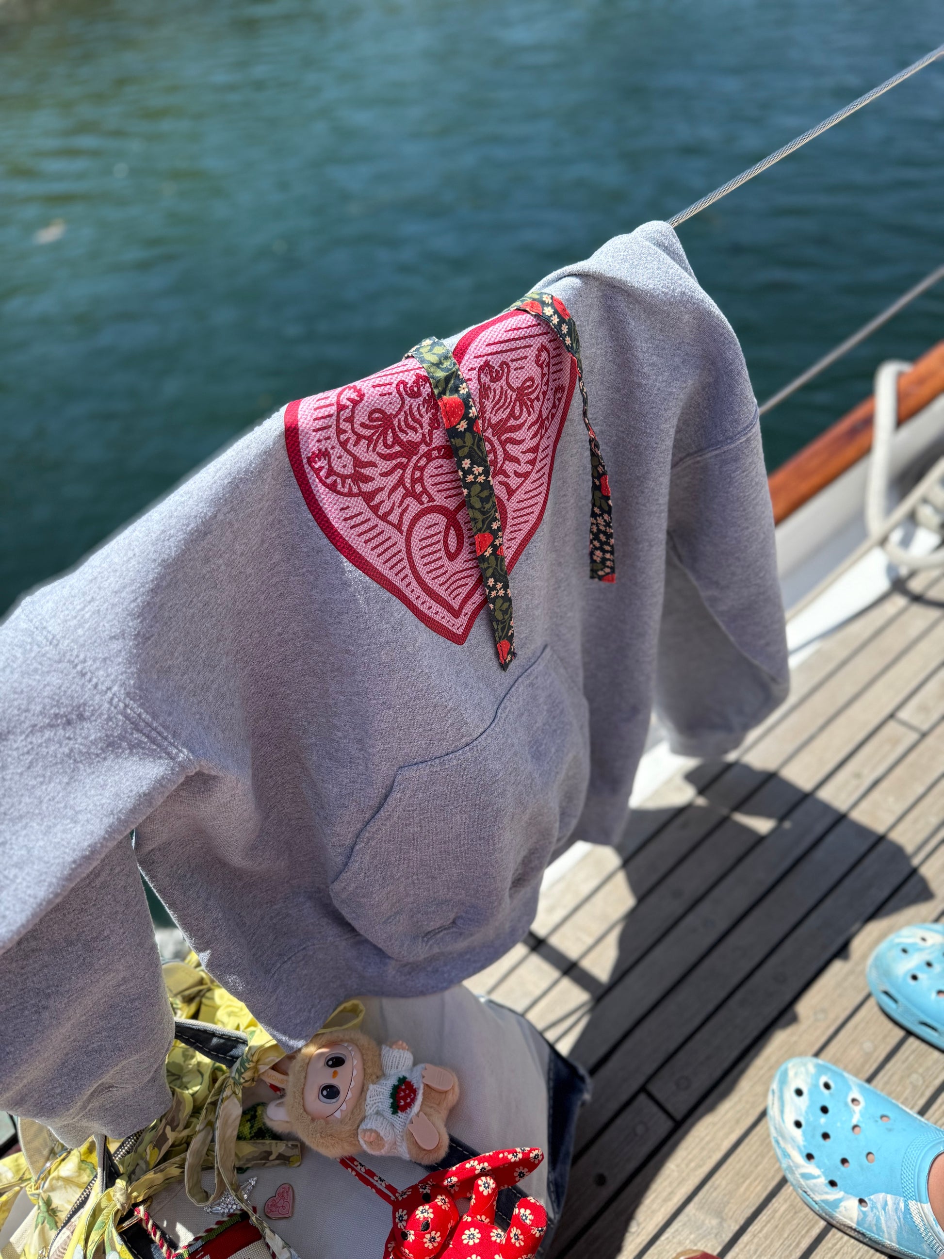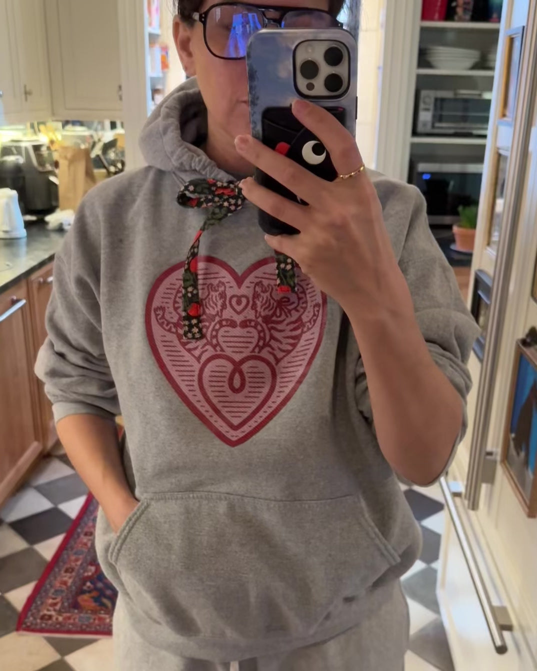 Your classic grey hoodie, featuring a flat, wide drawstring which is showcasing one of our exclusive artist’s prints. Our signature tiger logo is imagined with a faux needlepoint stitch. This part of the design is heat transferred on, which gives it a firm feel and brilliant color staying power. The drawstring's length allows for a graceful bow at the neckline, adding an elegant touch- it is hand sewn and made of USA cotton. It will need a steam after washing, or do what we do- take it out and put it back in with a drawstring tool! A slouchy fit without being too oversized, this grey masterpiece only gets better with each wash. Unisex sizing and generously cut.