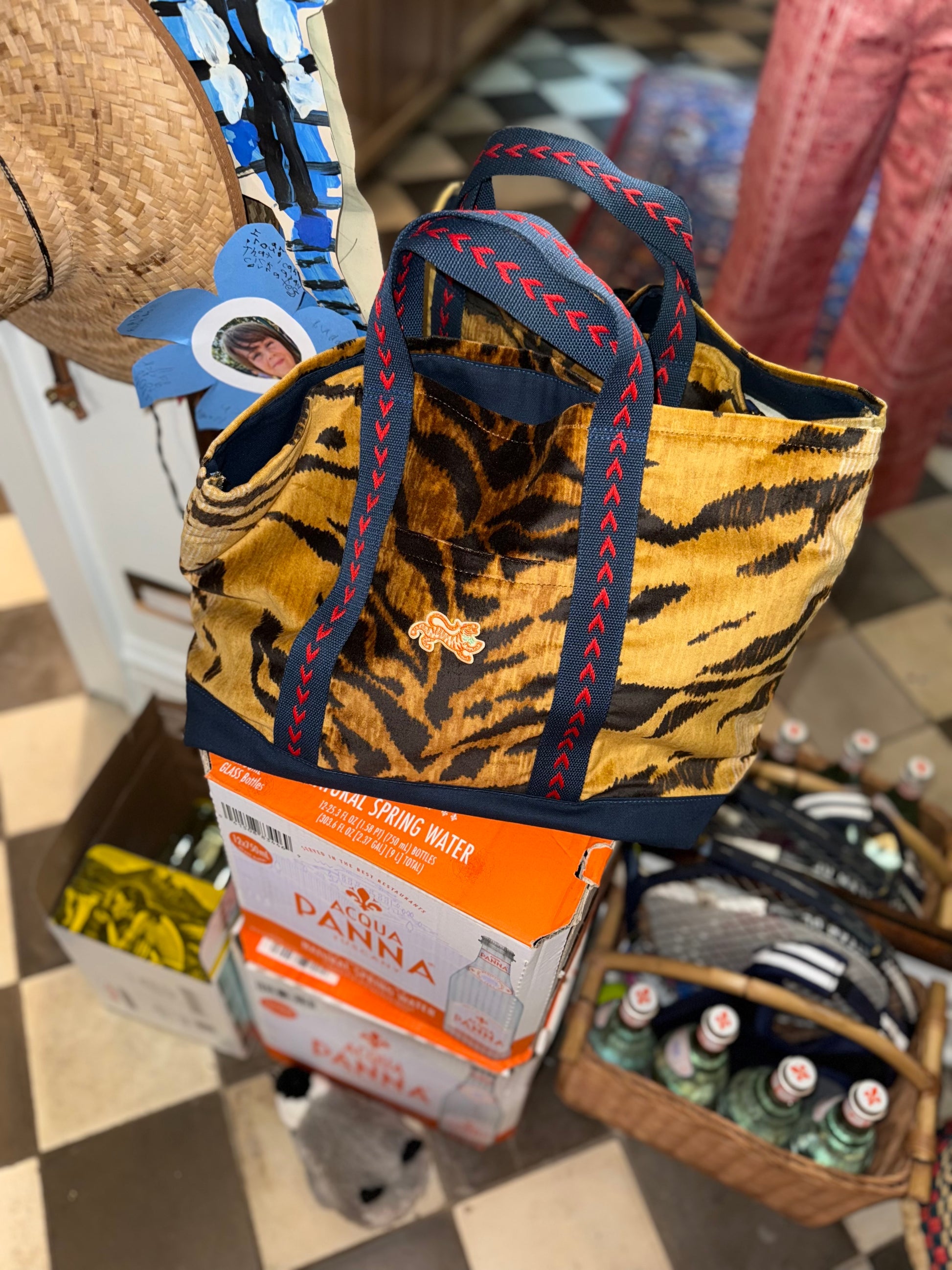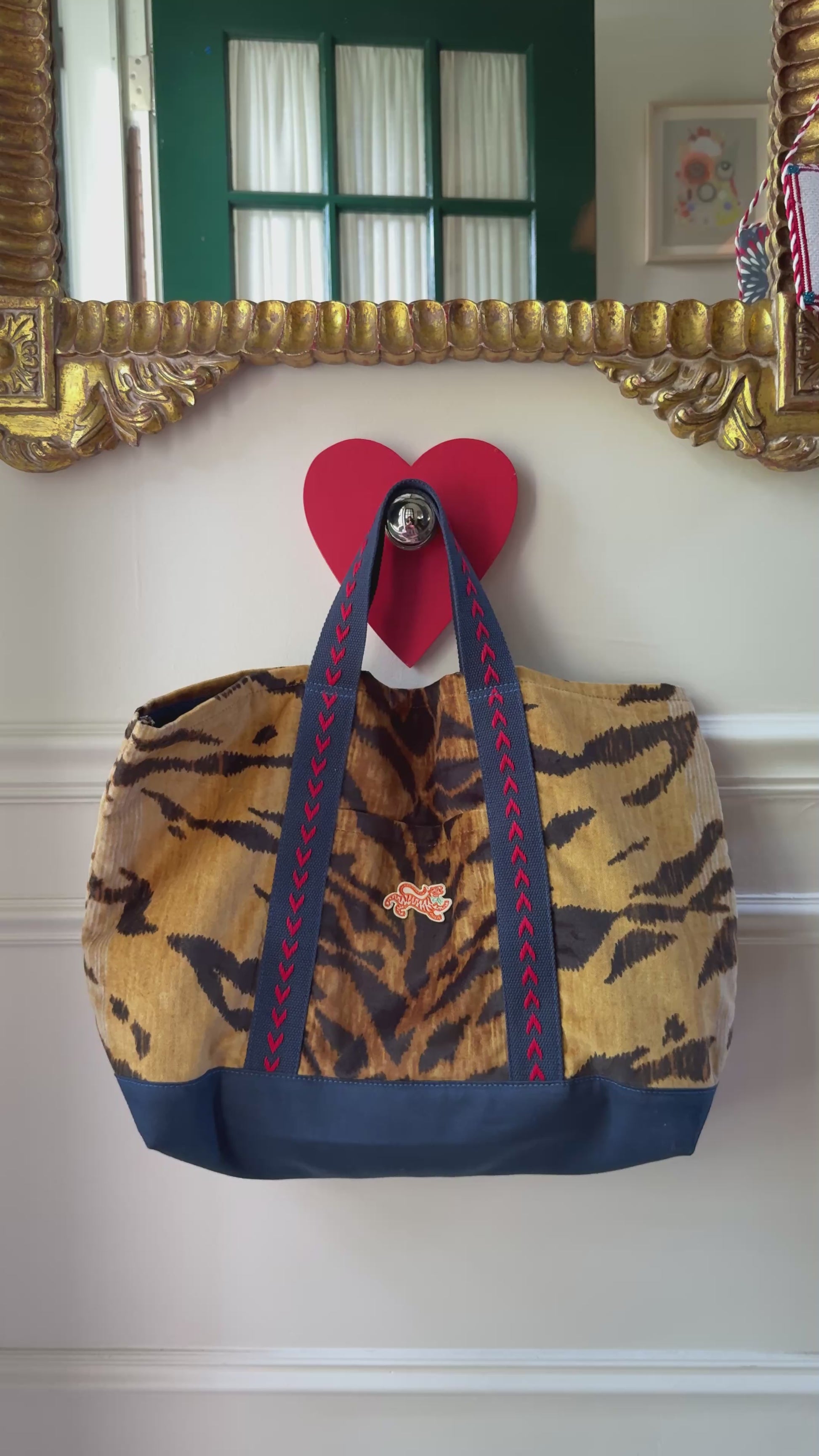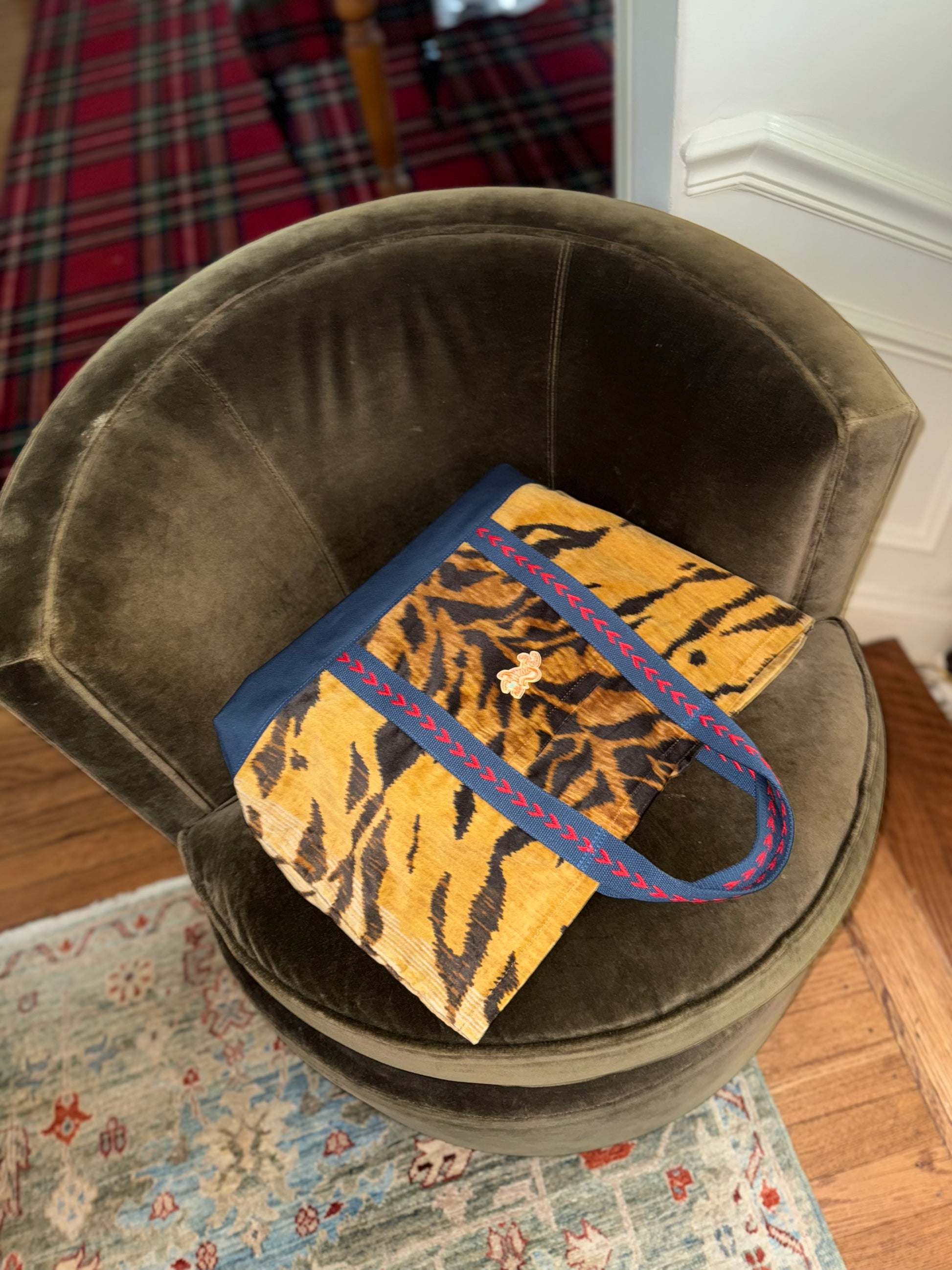 This is the boat-and-tote you always wanted but couldn’t find: tiger print, velvet, and slouchy in the best way. Made from mid-century modern–inspired ombré cotton velvet with chocolate stripes over a sunset wash of gold, silver, and orange. Lined in navy canvas to give it a touch of support—just enough to keep it functional, not boxy.