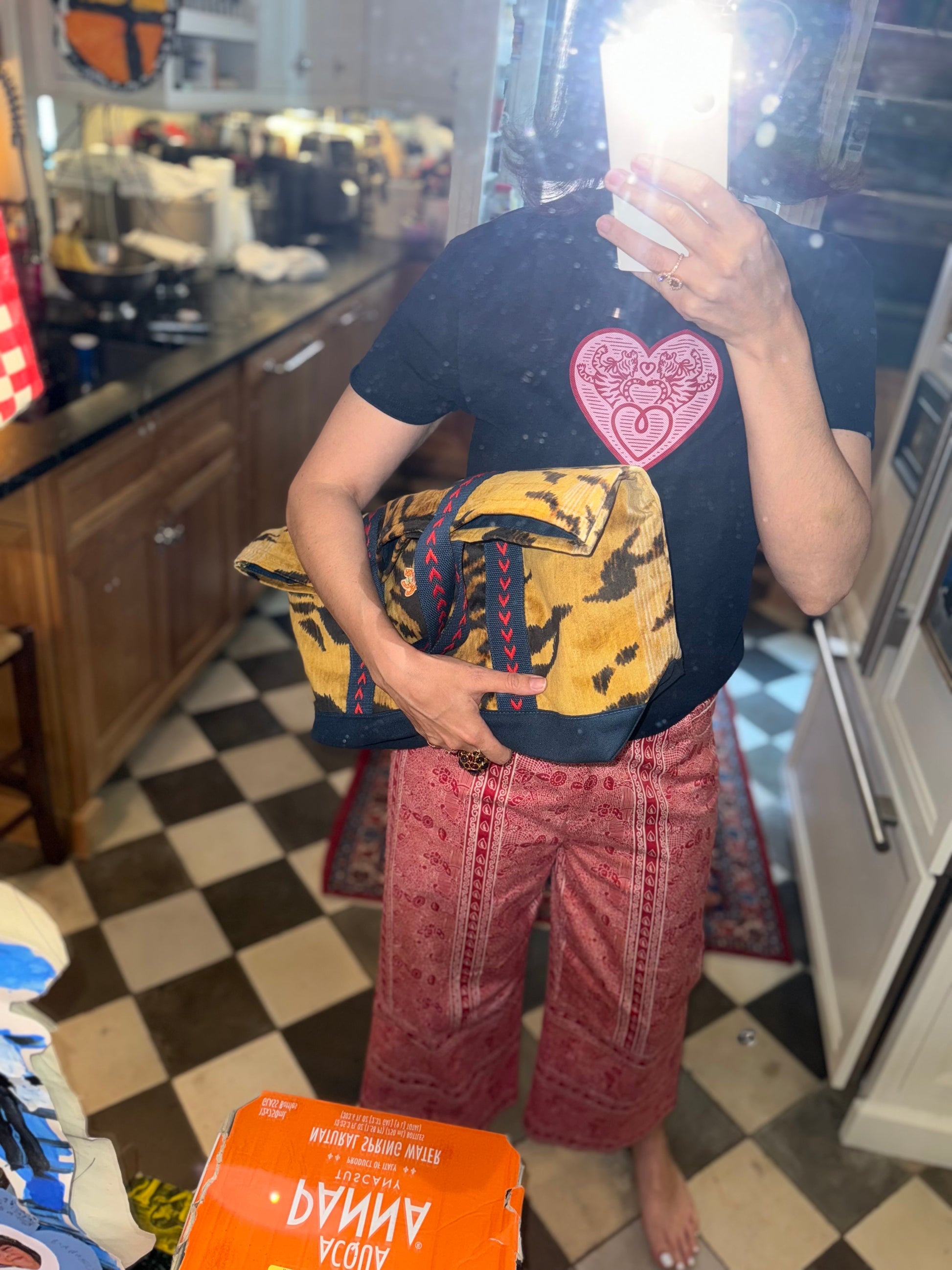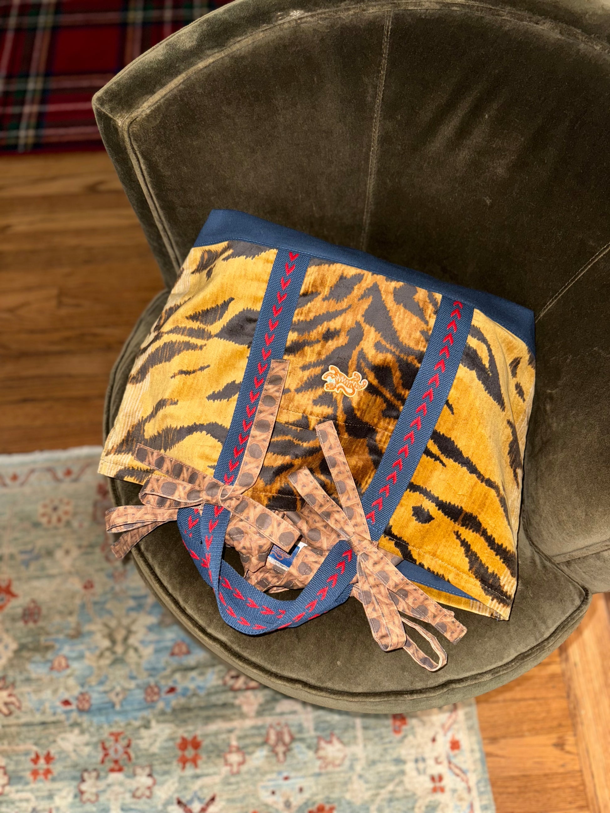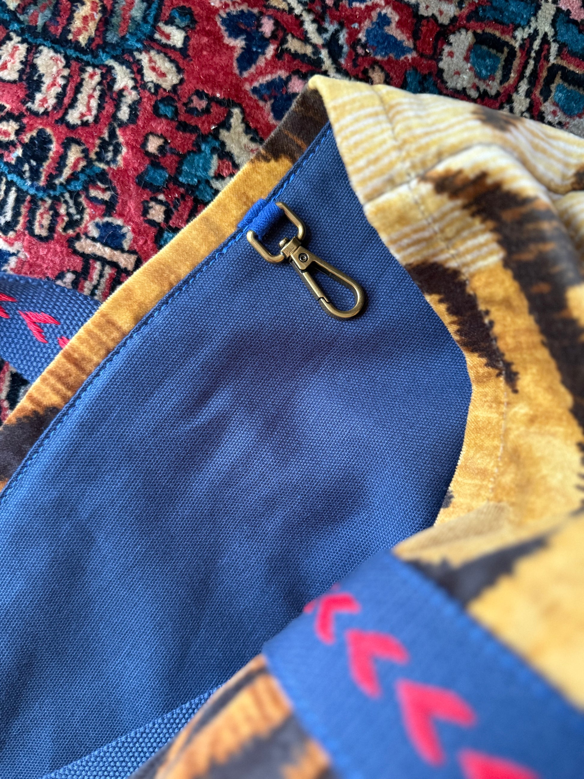 This is the boat-and-tote you always wanted but couldn’t find: tiger print, velvet, and slouchy in the best way. Made from mid-century modern–inspired ombré cotton velvet with chocolate stripes over a sunset wash of gold, silver, and orange. Lined in navy canvas to give it a touch of support—just enough to keep it functional, not boxy.
