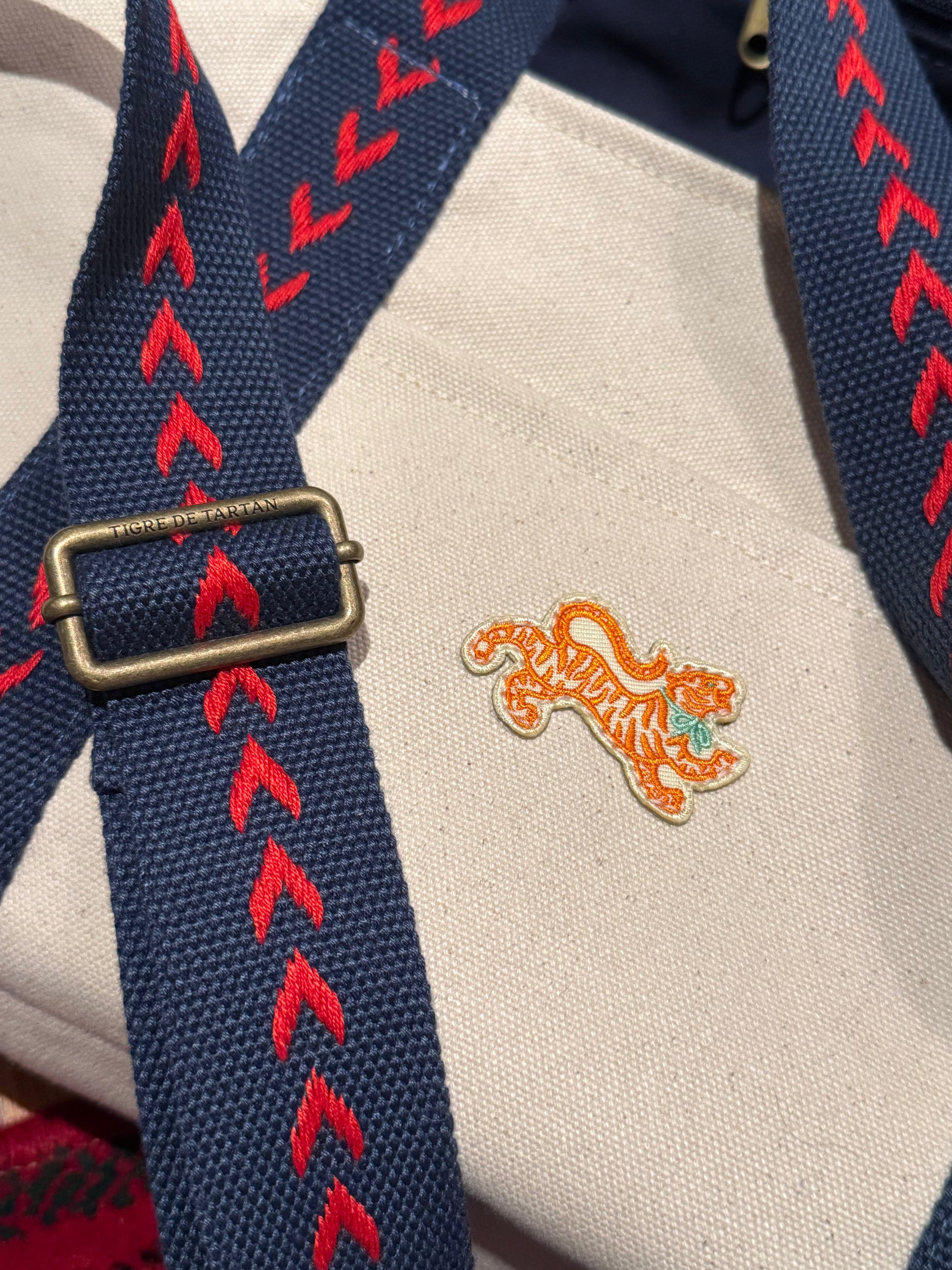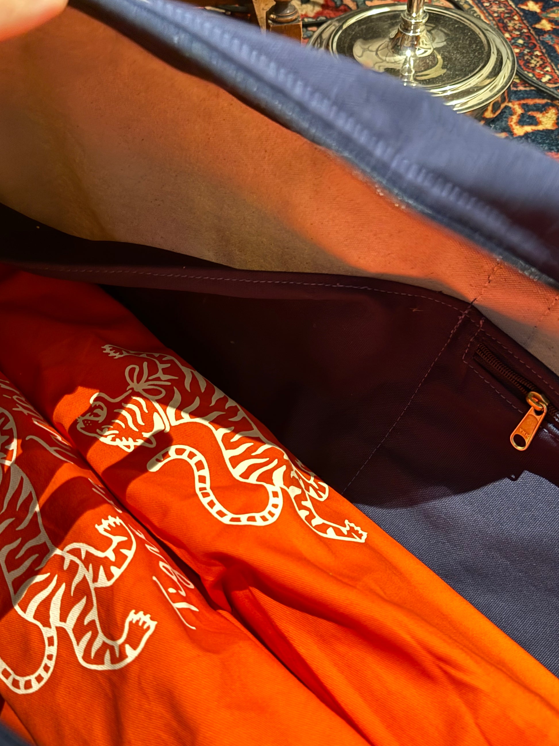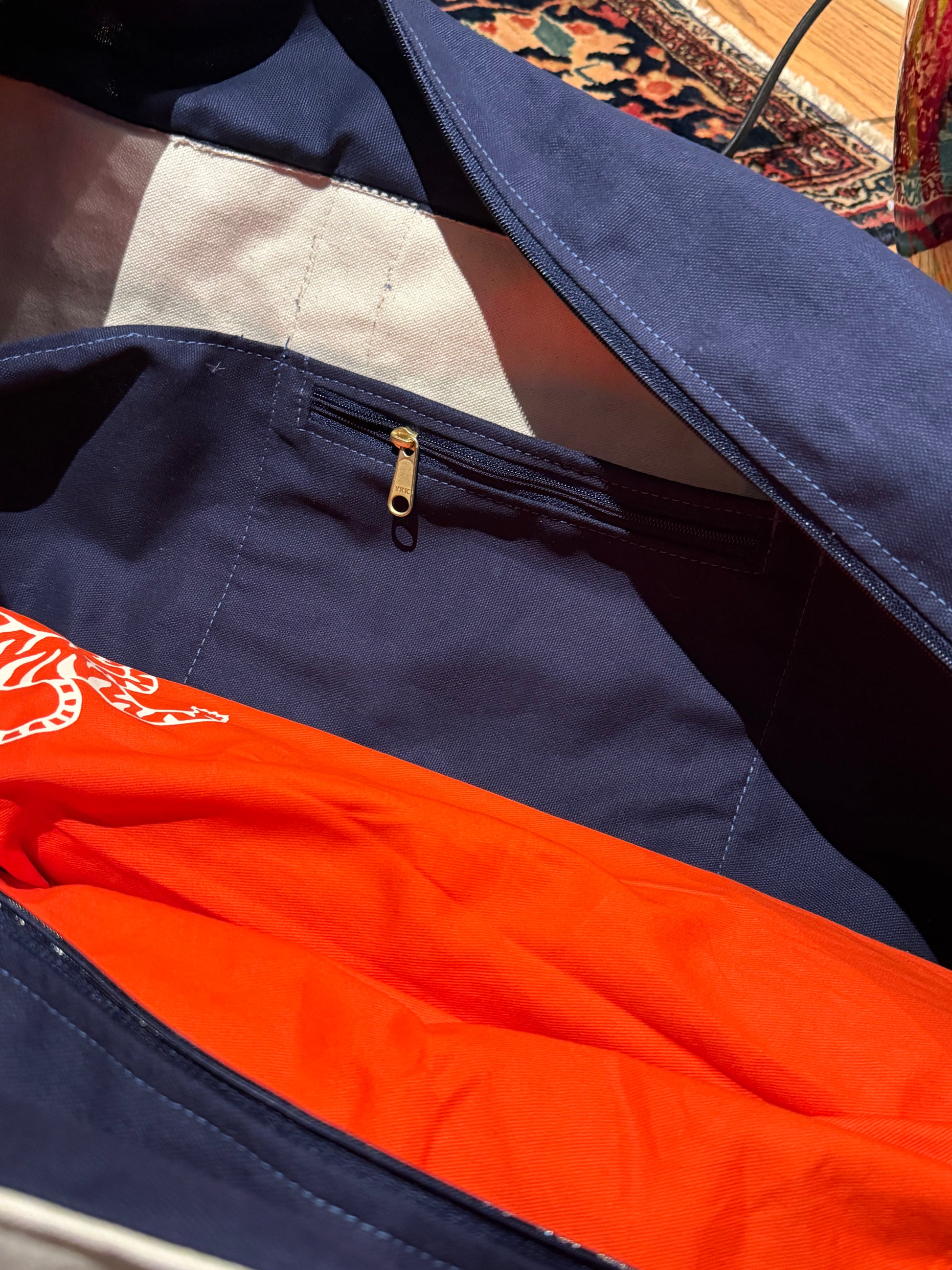 Made in the USA from premium Big Duck canvas (yes, the fancy stuff), this bag is structured, substantial, and intentionally overbuilt. It features six interior pockets- one with a zipper for the non-negotiables- and an exterior pocket for anything you want within arm’s reach. The adjustable crossbody strap includes custom Tigre logo hardware because of course it does.