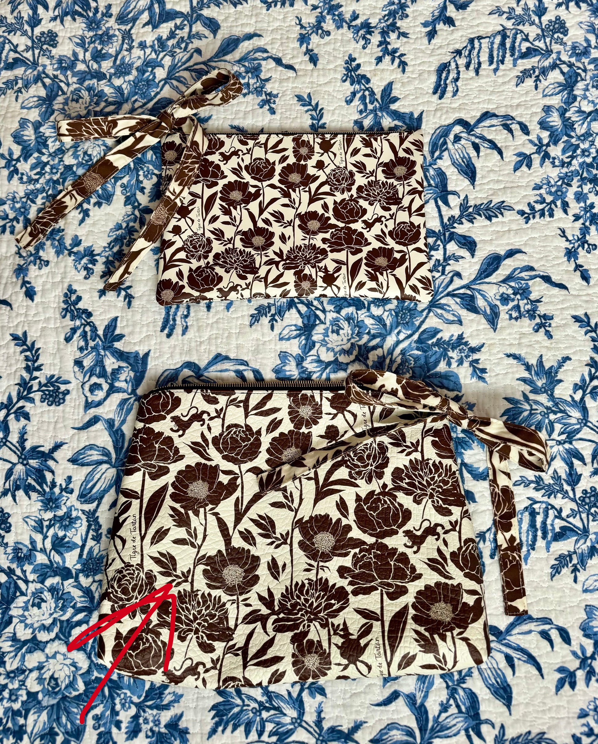 Featuring our exclusive house prints, a satin lined interior and a brass finished finger ring pull, this amply sized bag is sure to keep your tote tidy or keep your style fresh when you want a simple bag on the go! Brought to life by an independent female artist, each of the elements, including our signature trompe l'oeil gold buttons, are carefully drawn and custom printed on textured Nappa leather. Hand made to order in London, England.
