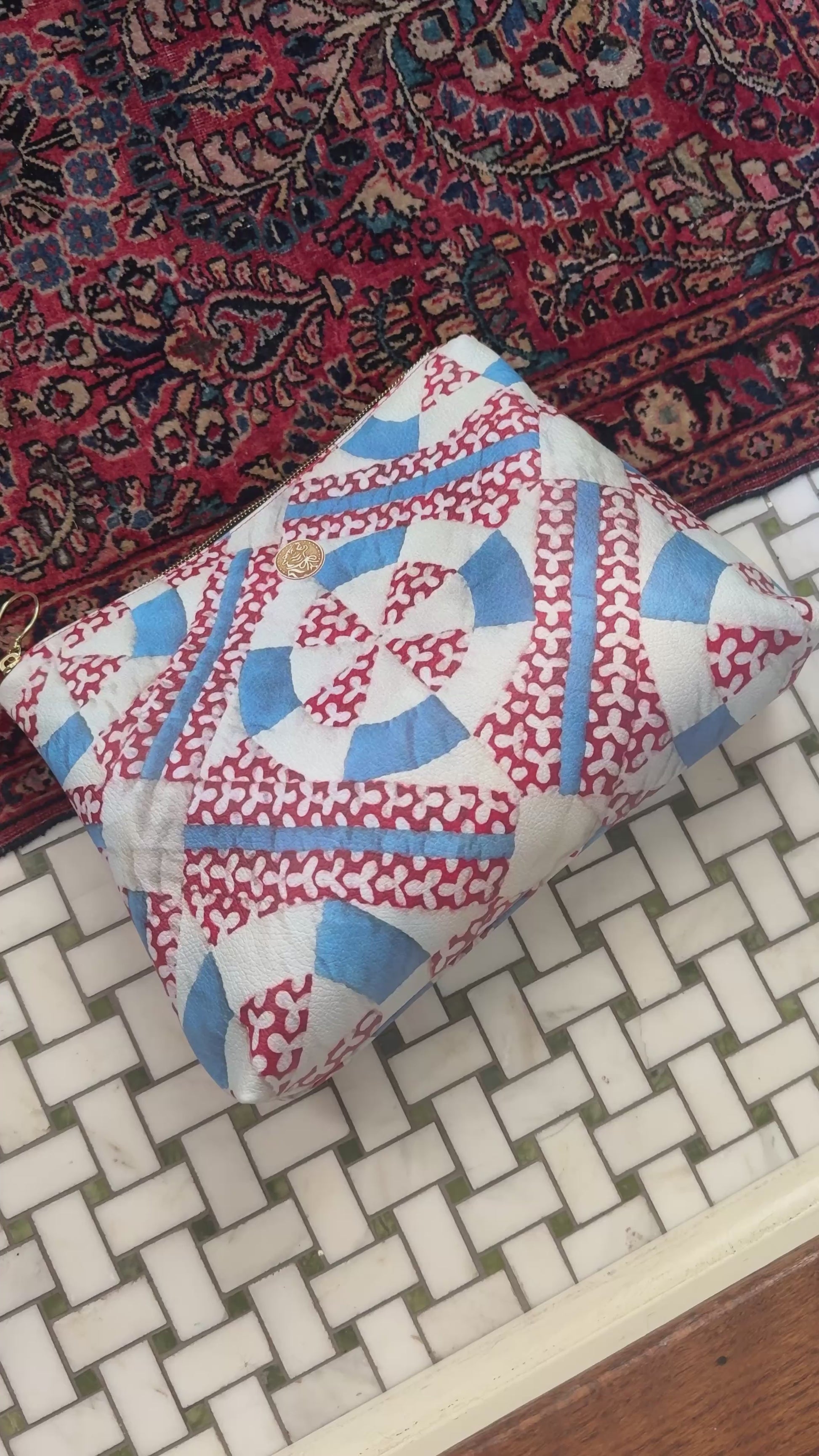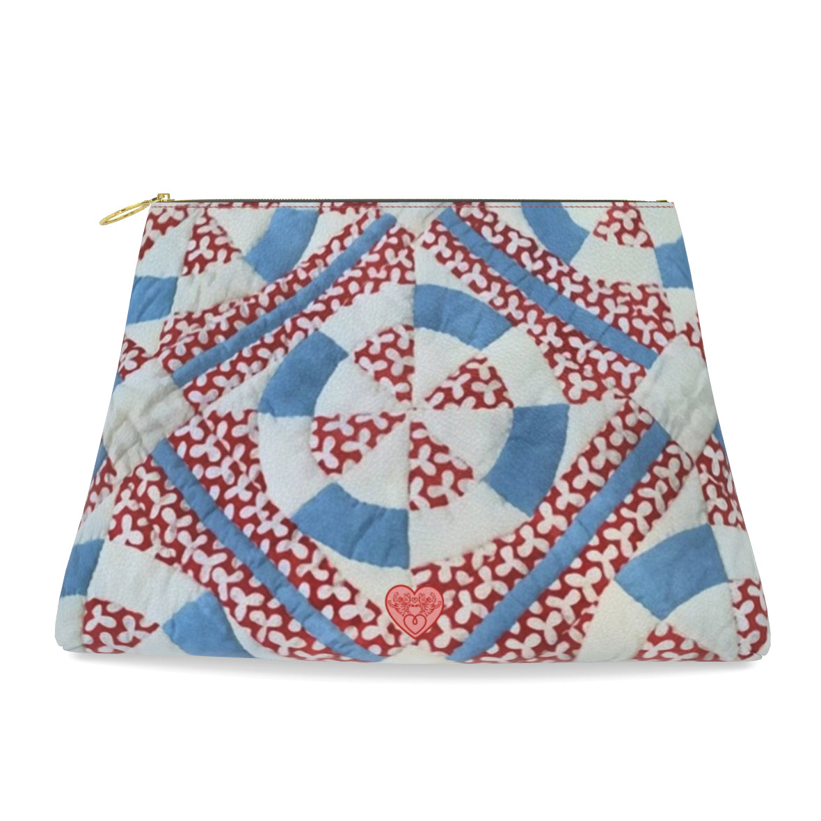 The Union Crossing print began with a vintage red white and blue quilt from Jess’s archive. Tigre de Tartán reinterpreted its intersecting arcs into an exclusive custom illustration, rendered for a bold yet abstract effect. The artwork is printed on textured Nappa leather, transforming a heritage quilt block into a fine-art accessory.
