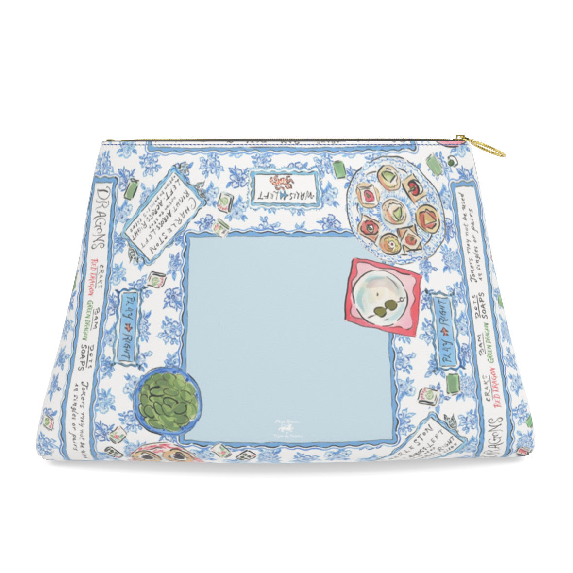 Make your game unforgettable with this whimsical "Mahj and Martinis" tile bag. Or, carry this bag as a kitschy clutch! This bag is a patchwork design printed from our matching mahjong mat. Featuring Mahj rules and lingo, whimsical snacks all in a beautiful watercolor medium.